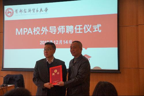 在讲座前,MPA教育中心举行了简短的公共管理专业硕士(MPA)校外导师聘任仪式。校党委书记冯培教授向受聘导师、原国家市场监督管理总局巡视员(正局级)徐晓东颁发了聘书。徐晓东在发表感言中表示将珍视MPA导师的荣誉,认真履行实践导师职责,以实际行动全力支持日本三级 MPA教育事业。徐晓东巡视员在外商投资准入、市场监督管理、信用体系建设和政府信息化应用领域多有建树,曾参与或主持起草过多项我国市场监管领域的法律法规,此次受聘为我校MPA导师,对促进MPA教育发展和公共管理学科建设具有重要意义。