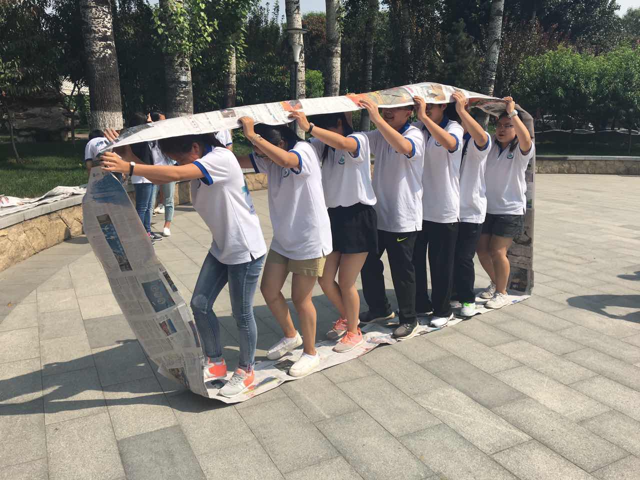 随后,考验团队沟通力、领导力,解决问题能力的拓展项目“盲人方阵”活动开始了。要求各组同学在戴着遮光眼罩的情况下,将一根长绳围成一个尽可能大的正方形,并且所有队员要均匀分布在各边,用时短者获胜。经过短暂的混乱和磨合,各组很快找到了各自的解题之法,有的团队一边尝试一边集众人之力讨论优化方法,有的团队在组长的带领下商讨好方案后再行动,所有队员听从队长指挥。每种策略都有各自的优缺点,每名班级成员在这个游戏中不仅锻炼了敏捷的思维方式,也增加了彼此的默契,各班的团队凝聚力和协调力有了明显的提升。这个项目架起了沟通的桥梁,还教会同学们在某些时候,服从的重要性。