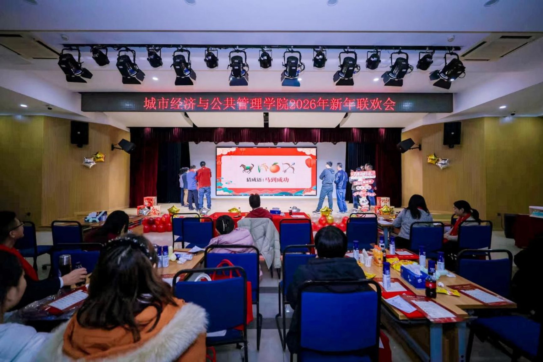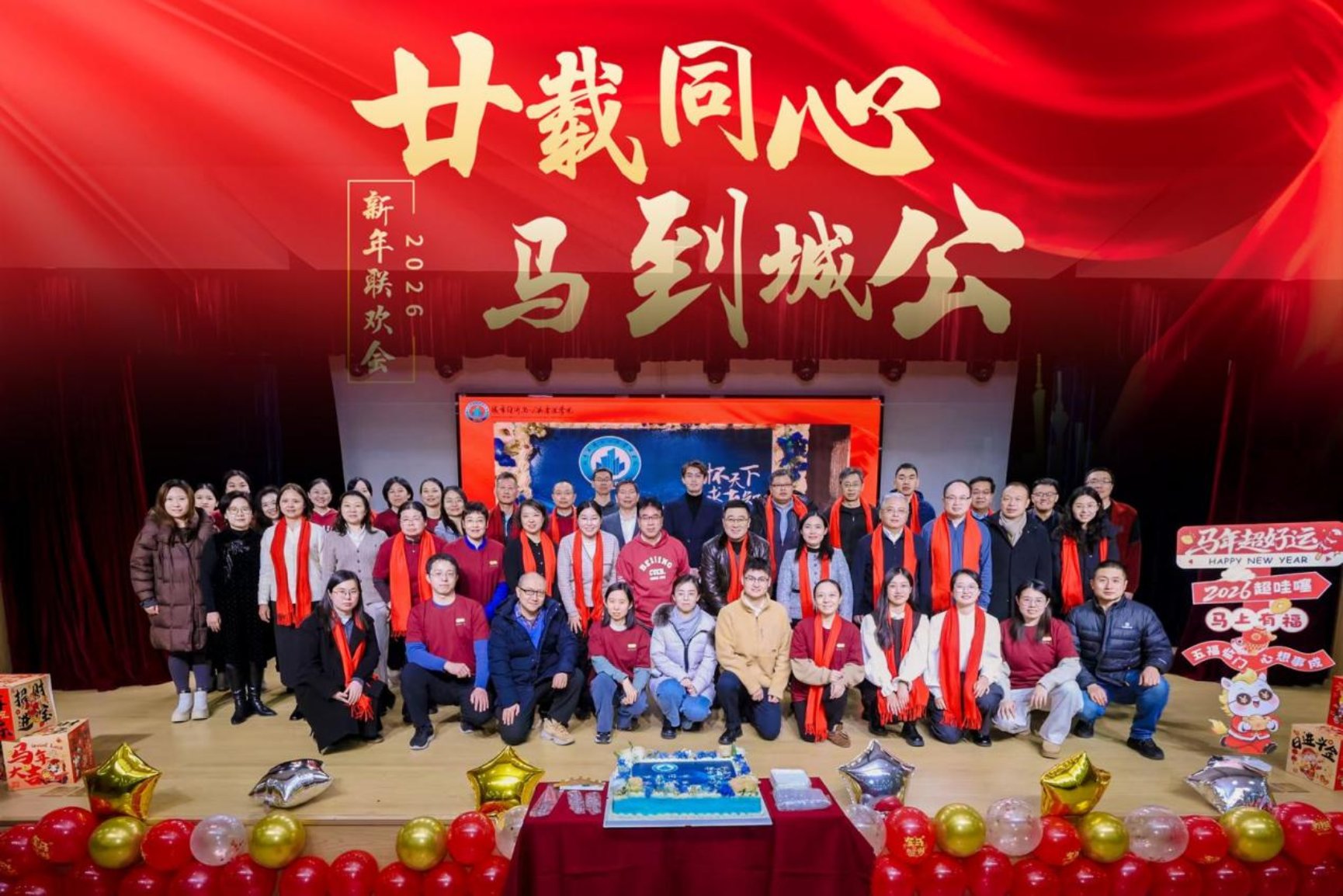 随后,温馨的切蛋糕环节如期而至。在《相亲相爱》的温暖伴奏下,印有 “廿载同心,马到城公” 字样的纪念蛋糕被推上舞台,学院领导与教师代表共同切开蛋糕,分享甜蜜与喜悦,象征着全院上下同心同德、携手共进的深厚情谊。全体人员共同合影留念,定格下这一温馨团圆的美好时刻。