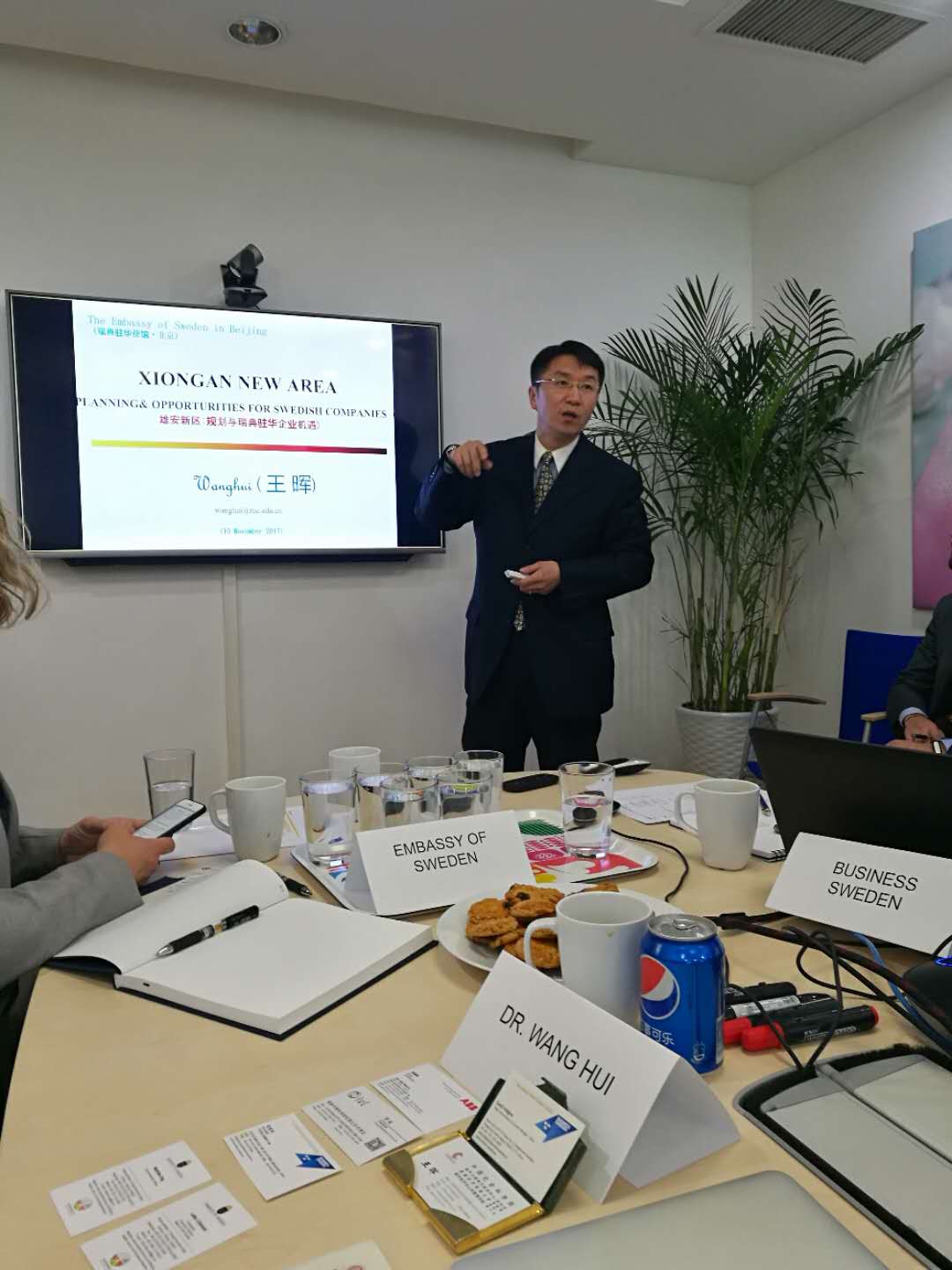 2017年11月10号下午两点,王晖老师来到瑞典贸易委员会办公室为瑞典驻华大使馆的使馆人员和瑞典在华公司的30多位工作人员讲解了雄安新区。首先瑞典驻华大使馆的环境官员马瑞英(Matilde Eng)和经济处企业社会责任中心主任尤丽莲(Lotta Liljelund)两位参赞先后致辞。接着瑞典贸易委员会中国区经理霍伦伟(David Hallgren)做了有关瑞典智慧城市平台的演讲。