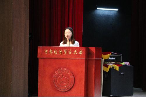 接着,是在校生代表冯子璇同学的发言。她首先介绍了城市学院的基本情况、育人价值观和城院精神。希望新生们在大学时树立目标,点燃对学习科研和生活的热情,保持身心健康,认真思考未来。言毕,她代表全体在校生向新生代表赠送了一份由全院师生精心挑选的,有助于新生成长的书单,象征着城院学子学识的薪火相传,寄托着全体在校生对于新同学的美好希冀。