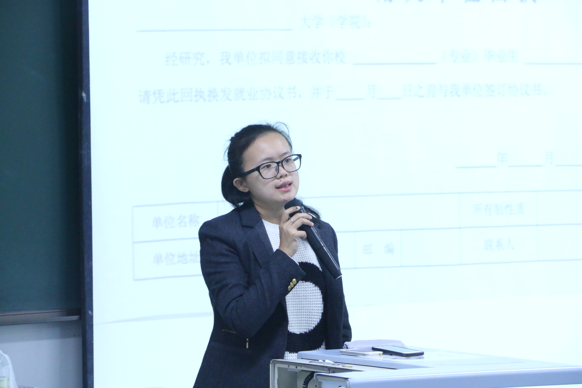 富蕾详细讲解了我校的就业流程,她以强调就业重要性为切入点,就2018届就业相关政策进行了全方面的解读,详细讲解了就业推荐表等相关表格的填写注意事项。其次,介绍了国家和北京市最新出台有关的就业派遣方面的政策,对相关专有名词进行了讲解,对于流程中存在较多的问题做了重点解释,同时对毕业生创业、考研、出国等政策、时间点分别做了详细介绍。接着,富蕾针对北京生源、外地生源的不同情况做了区分讲解,使同学们对就业过程中可能遇到的问题和困难以及如何做出正确选择有了一个前期的认识和把握。最后,富蕾预祝同学们有个美好的前景和未来!