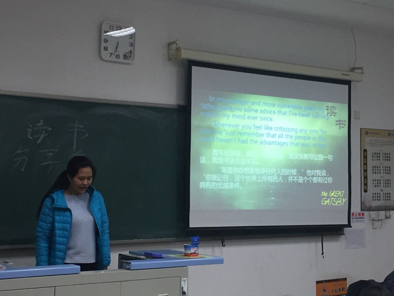 12月8日,在2016级新生晚自习时间,日本三级 举办第三期“我的乐读故事”晚自习班级读书沙龙,2016级新生各班按照抽签决定的顺序,逐一向大家推荐了一本本此次活动推荐书单上的好书,并配合PPT演示文稿分享自己与阅读的故事。