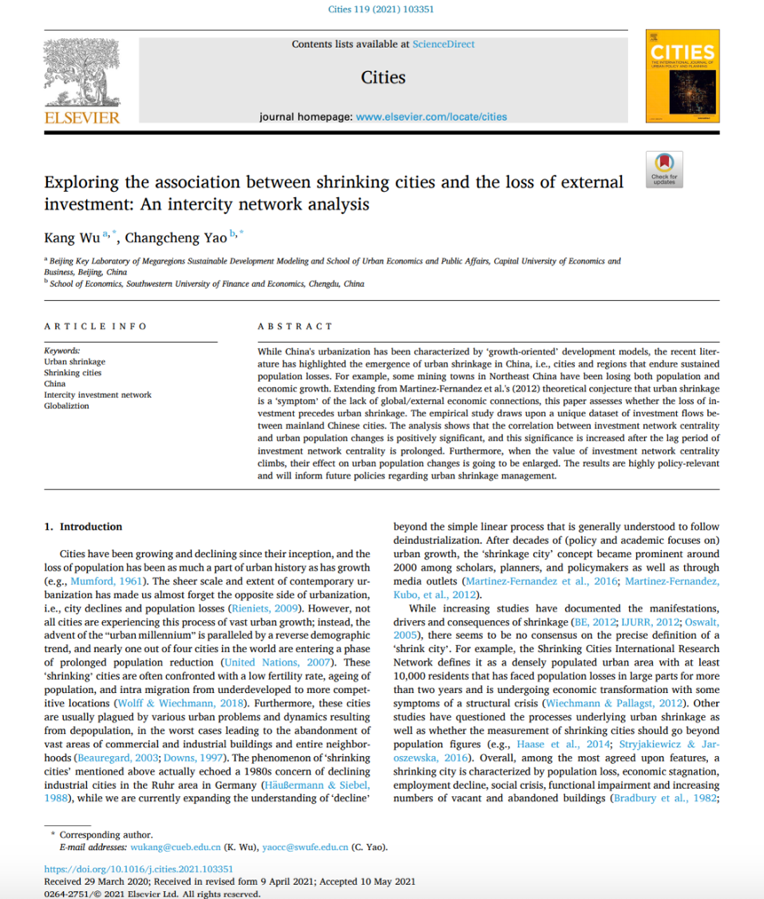 由日本三级 吴康教授作为第一作者的论文“Exploring the association between shrinking cities and the loss of external investment: An intercity network analysis”今年7月在城市政策与规划研究类国际期刊《Cities》上发表(//doi.org/10.1016/j.cities.2021.103351)。研究认为,虽然中国的城市化一直以“增长导向”的发...